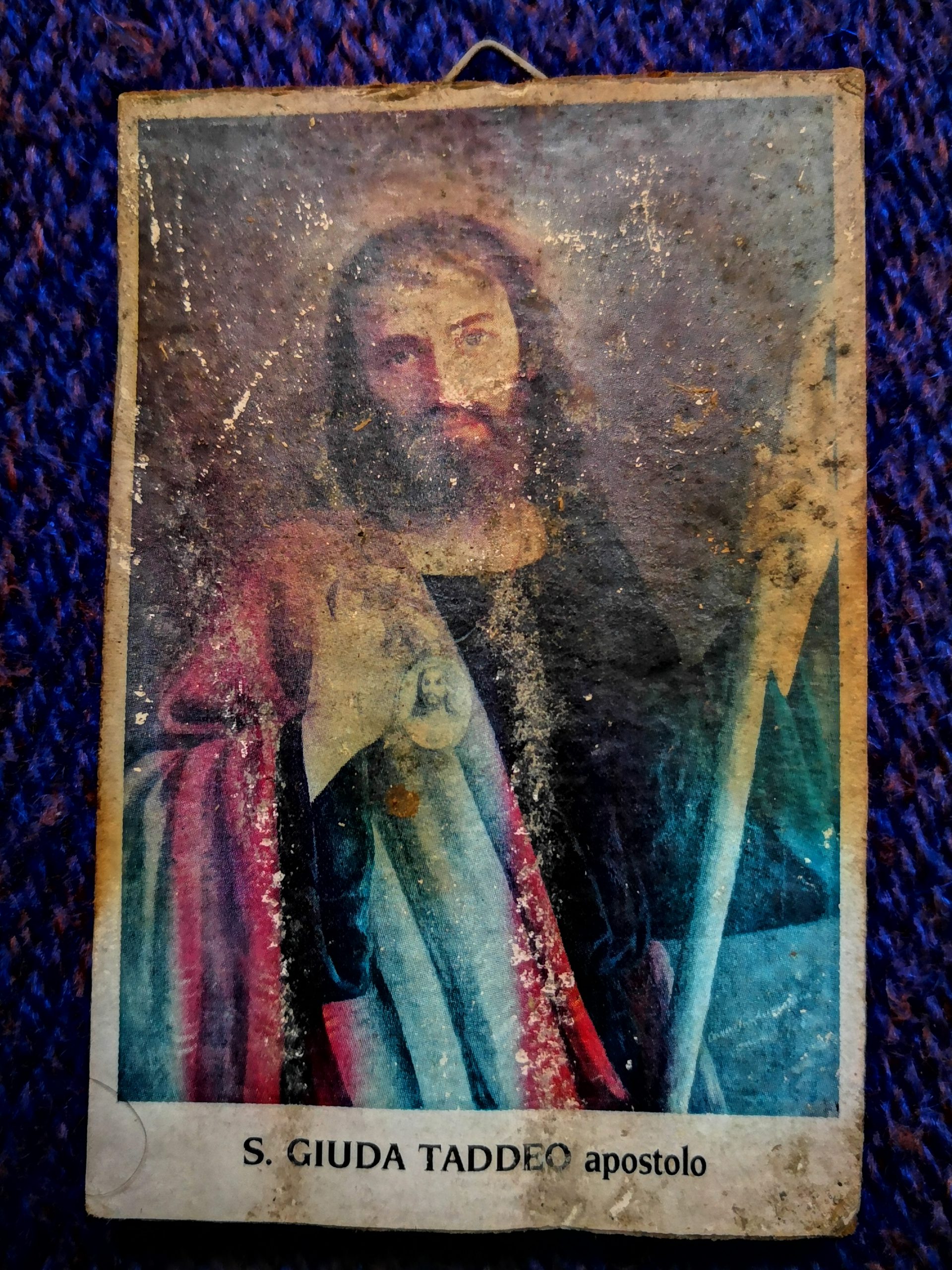 Icona occidentale di SANTO cristiano antico a cui un credente in difficoltà si rivolge per affrontare prolemi difficili se non insormontabili del vivere. I vari sistemi religiosi diffusi nel mondo usano gli OGGETTI (reliquie, immagini, statue, ecc.) per colmare la distanza tra l’umano e il divino.